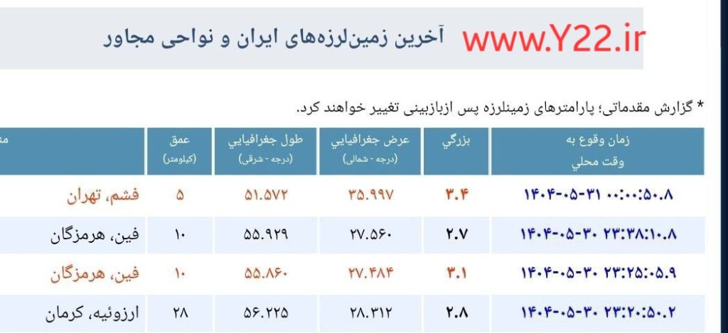 در ساعت صفر روز 31 مرداد 1404 در تهران زلزله 3.4 ریشتری آمد . شدت این زلزله با اینکه زیاد نیست، اما نگرانی هر لرزش در تهران از این رو پراهمیت میباشد که احتمال فعال شدن گسل های تهران را بیشتر میکند.
